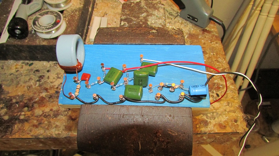 NOTE: We added the RFC1 part later, it is not shown this or the next few photos, but see below in this page for placement of RFC1 and also C5 changed to 1 uF instead of the 0.22 uF shown in the photos.