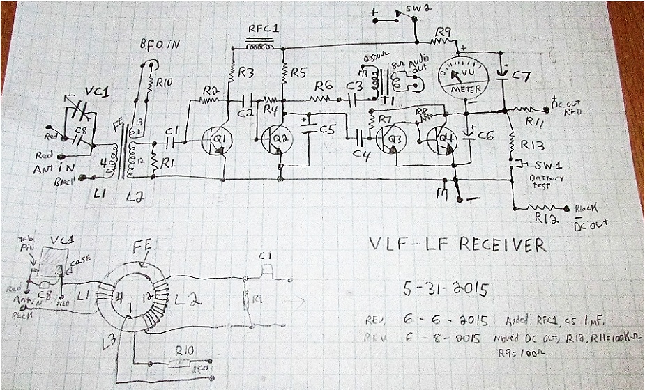 We made some modifications on 6-6-2015 which are very important to allow the receiver to work well across the full 10 KHz - 300 KHz range: We added RFC1 RF Choke and changed C5 to 1 uF. See the following photos: