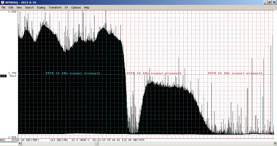 You can also watch WWVB fade out an hour before local sunrise, and signal level increases at night an hour after sunset each day. A sudden drop in recorded signal strength at night indicates you may have recoreded an astronomical event.
