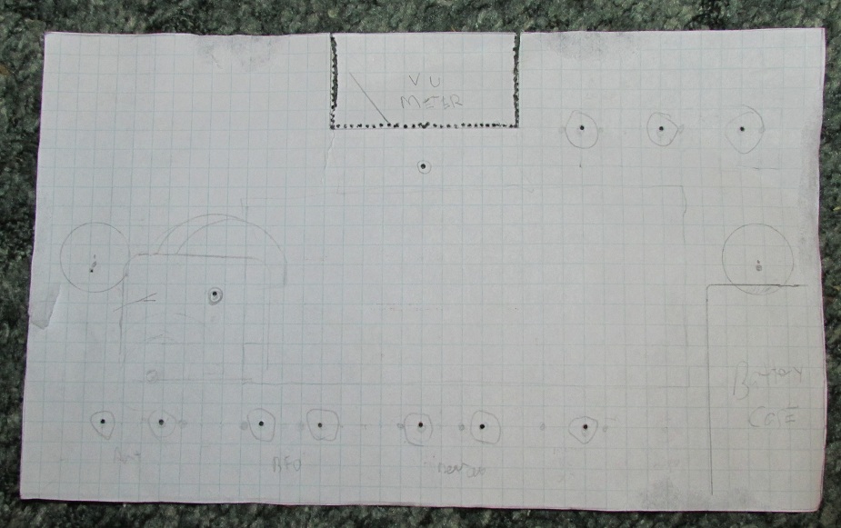 A drawing template was made on a piece of graph paper. The size is 1:1 and it was taped onto the wood board and was drilled thru the marked points. The cut out of the meter hole was done by drilling out the part of the board along where the meter will be mounted. Use as small a drill bit as you can find, and drill holes carefully along the inside of the lines you mark. The use a hack saw to gently cut down the vertical portions. The whole piece can be snapped out, then use sand paper to smooth down the drill holes. You can also use a jig saw to cut out the whole piece without needing to drill the 100 tiny holes along the lines.
